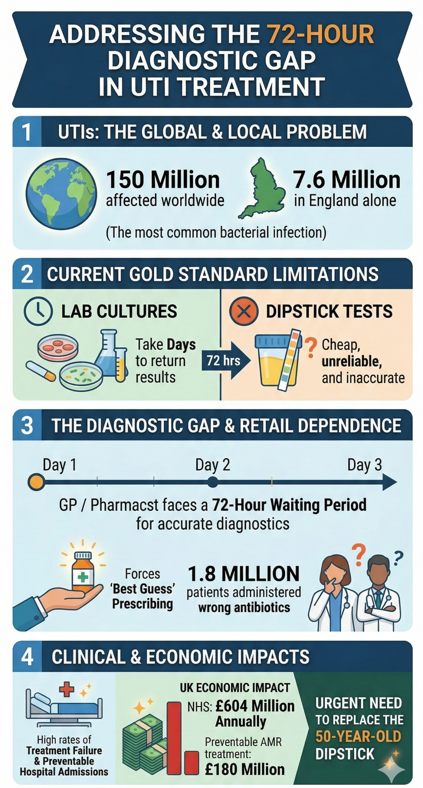 We address the critical “72-hour diagnostic gap” that currently forces clinicians to prescribe antibiotics empirically. While Urinary Tract Infections (UTIs) are the world’s most common bacterial infection, affecting 150 million worldwide and 7.6 million people in England only, the current gold standard for diagnosis relies on laboratory cultures that take days to return results. Or cheap unreliable dipstick tests.
